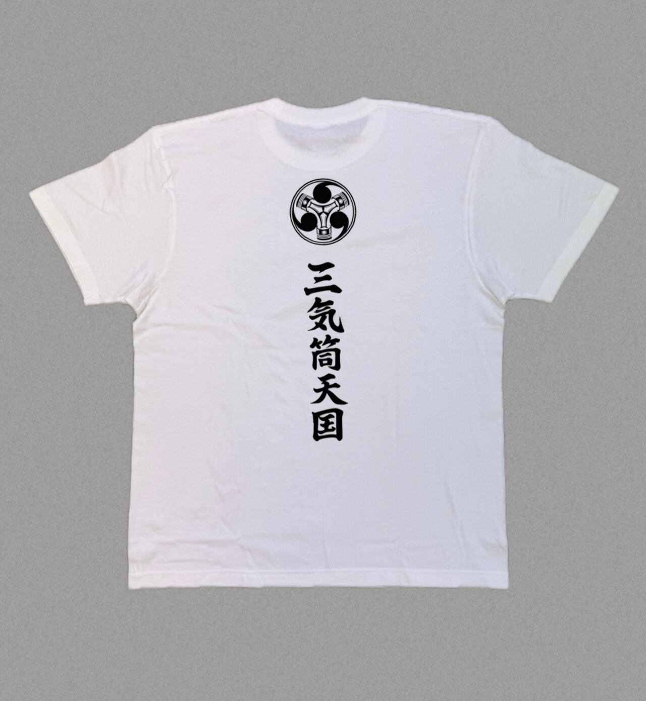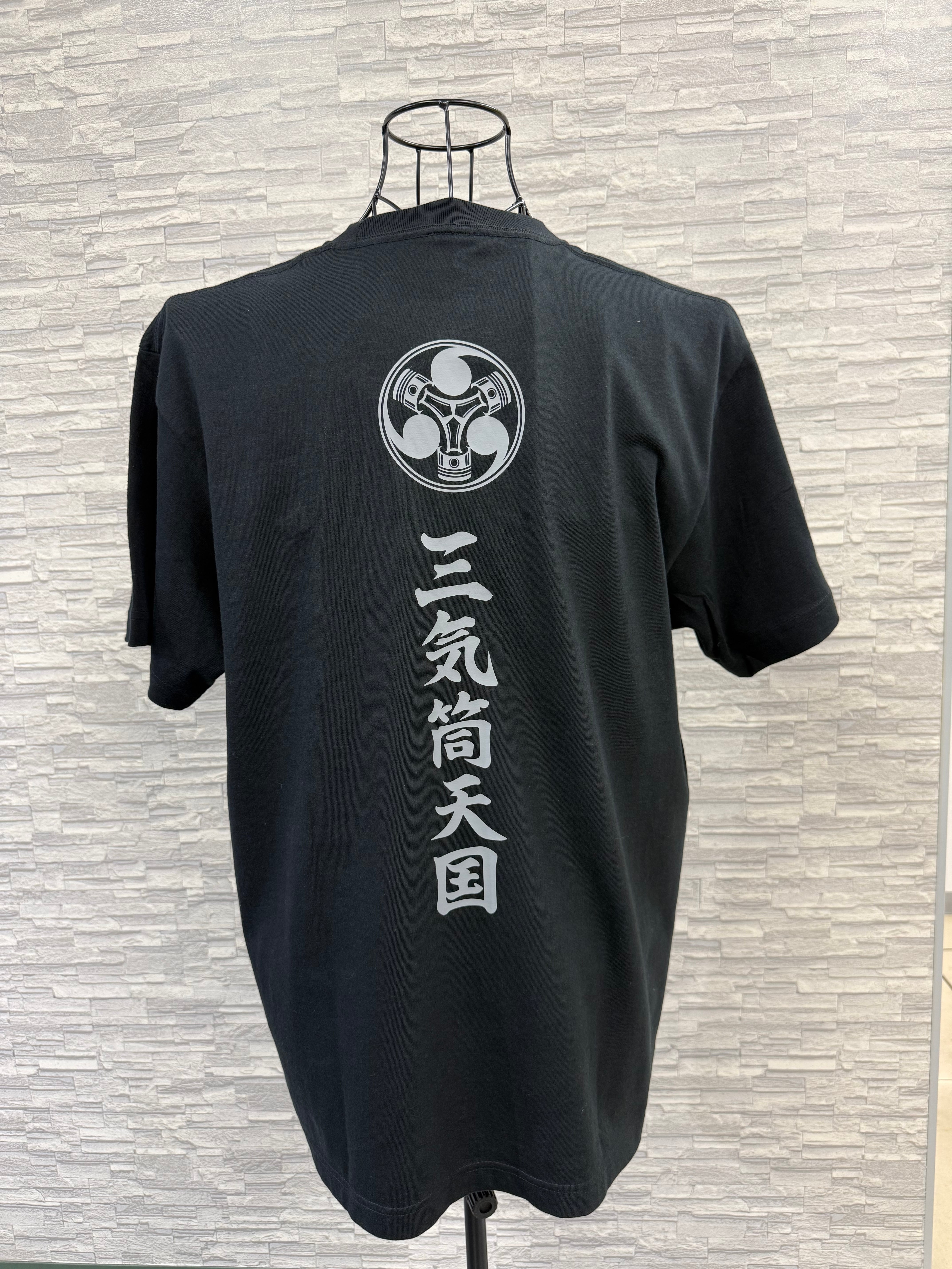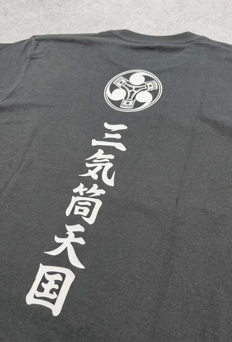 背面の「三気筒天国」とともに、三気筒エンジンへの情熱をこの一着に込めています。