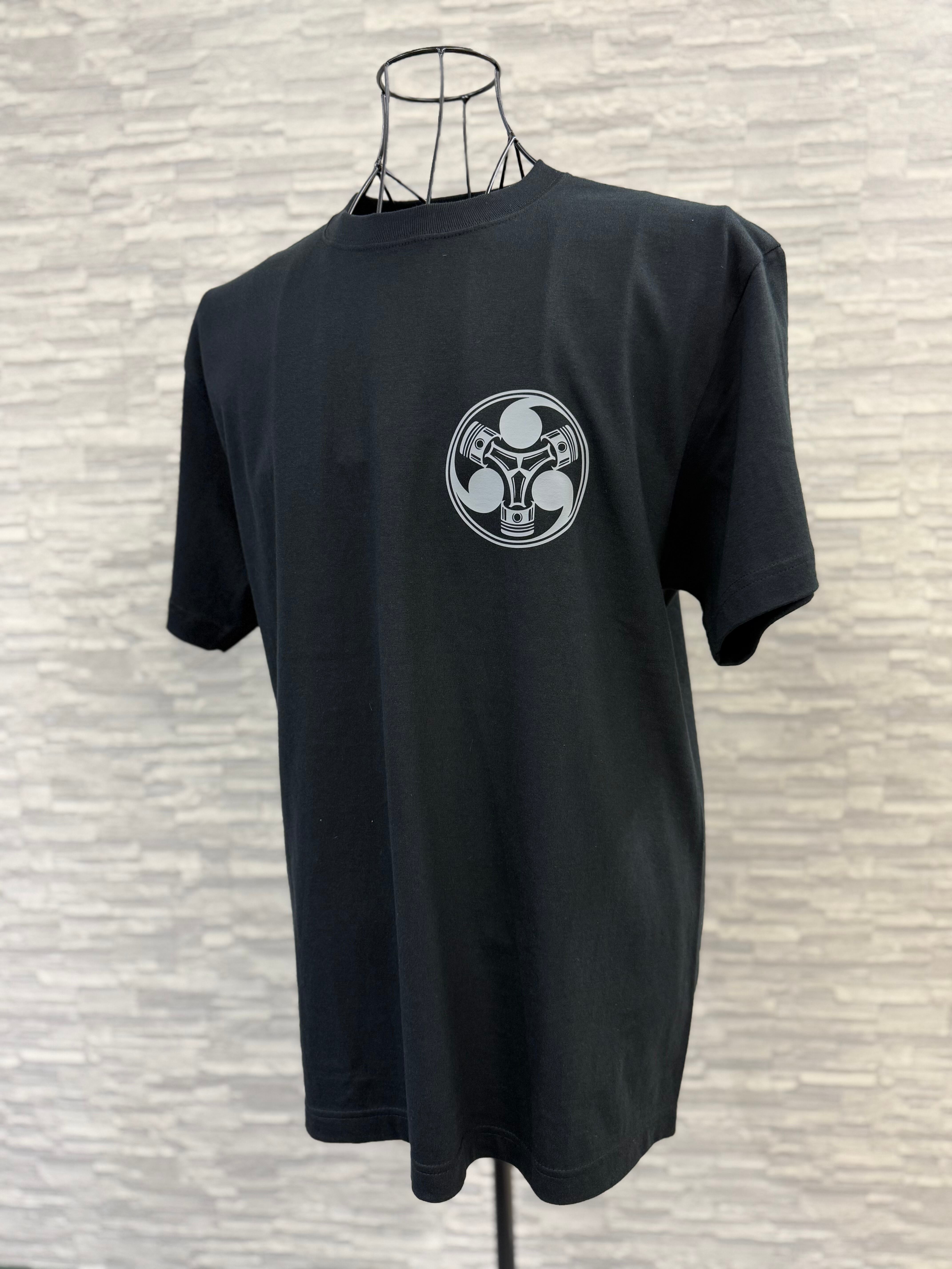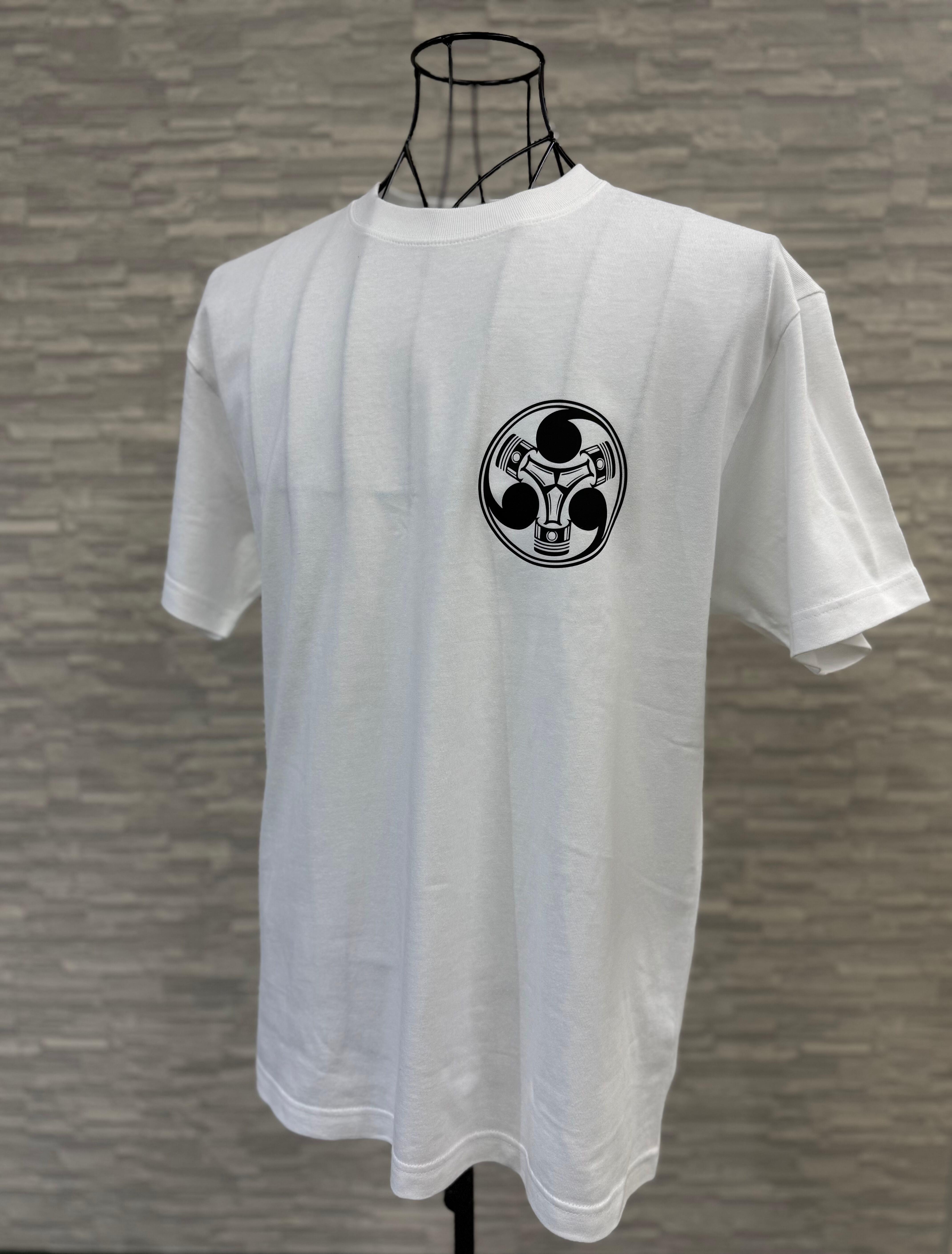 胸元に刻まれた「三つ巴ピストン」ロゴは、日本伝統の三つ巴紋をベースに、ピストンを融合させました。